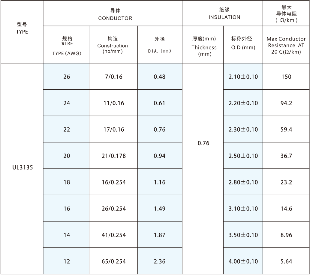 導(dǎo)體采用單根或絞合26-12AWG鍍錫或裸銅絲