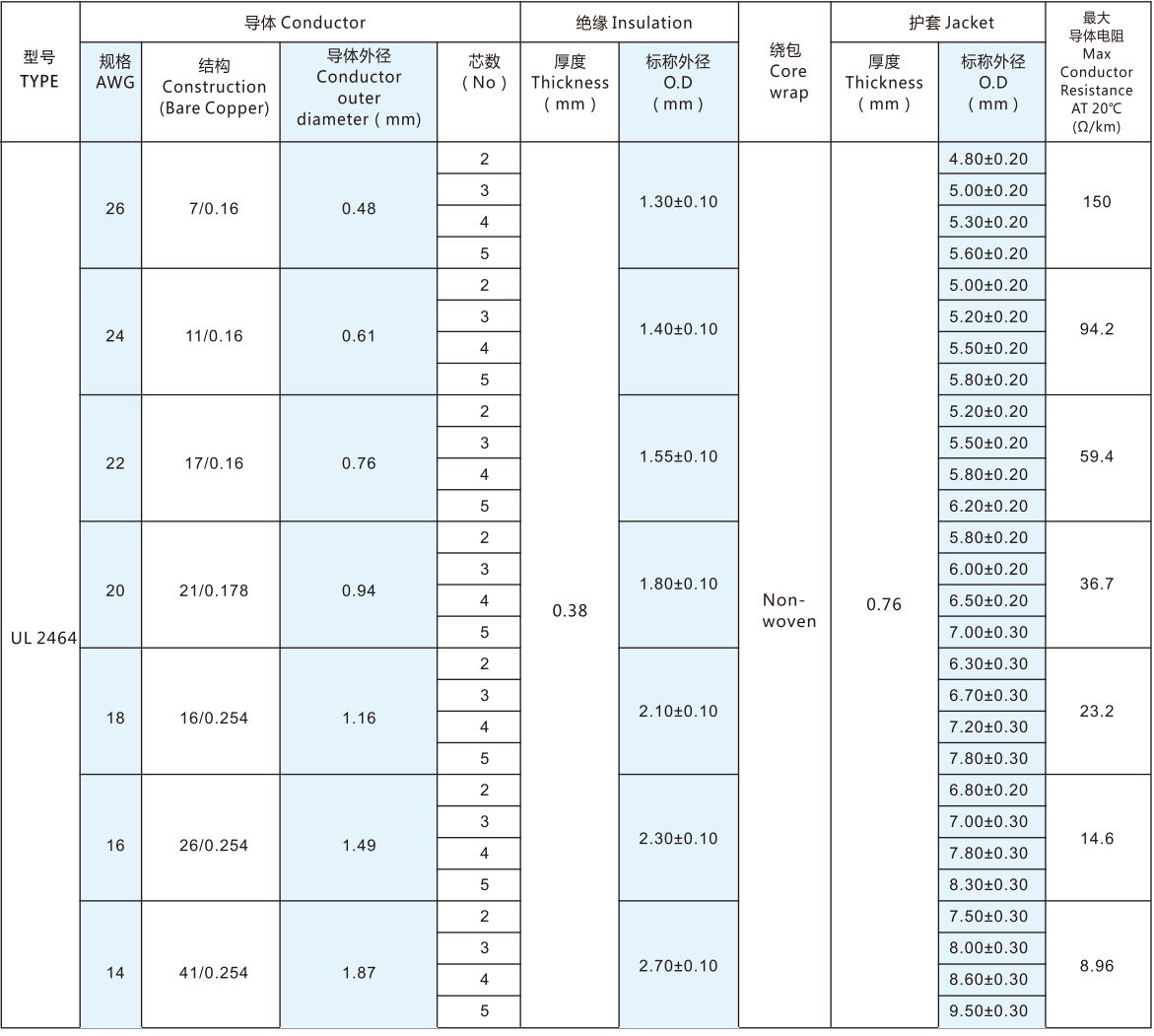 導體使用單根或絞合30-14AWG鍍錫或裸銅絲