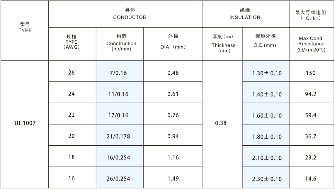 導(dǎo)體使用單根或絞合26-16AWG鍍錫或裸銅絲